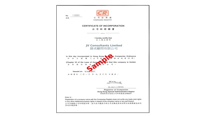 香港法人の設立は主に下記3ステップを要し、法人設立を証明する書類としてCertificate of Incorporation(会社設立証)がCompanies Registry(会社登記所)より発行されます。Certificate of Incorporation(会社設立証)は会社設立時に一度のみ発行されます。会社の銀行口座開設、ビザ申請の場面で必要となります。